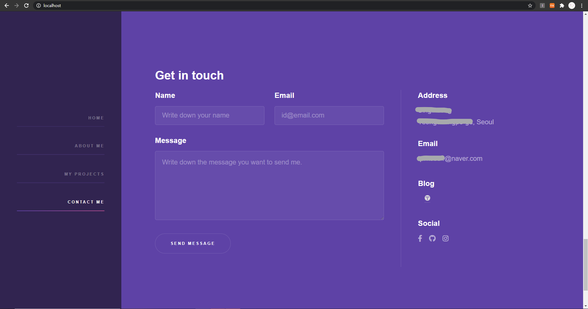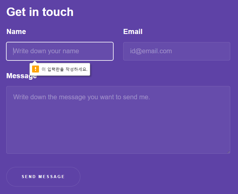 각각의 input 태그에 required 속성을 추가했습니다! 그러면 아래 보시는 것처럼 안채우고 send message 버튼을 클릭하게 되면 submit이 안되고 경고 메세지가 뜹니다!