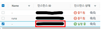 1. 아마존 홈페이지 접속 > 서비스 > EC2 > 실행 중인 인스턴스 > 빨간 네모 박스 클릭 (내가 상태를 확인하고 싶은 인스턴스의 ID를 클릭)