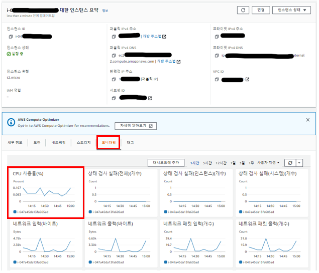 2. 아래의 "모니터링"을 클릭하시면 내 인스턴스의 상태? 정보?를 확인하실 수 있어요!