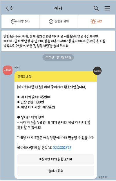 이렇게 카톡으로 알림이 옵니당! 실시간으로 앞에 대기 번호가 줄어드는 걸 볼 수 있어요!