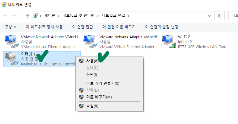 그리고 나면 아래의 이더넷 (저의 경우 이더넷 13으로 나와있네용)을 마우스 오른쪽 버튼을 클릭해서
