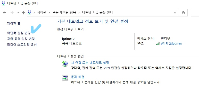 제어판 > 네트워크 및 공유센터 > 어댑터 설정 변경을 클릭하세요
