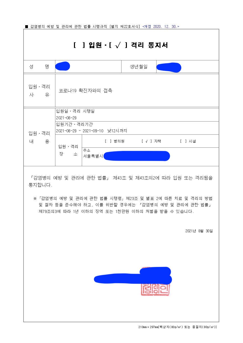 그리고 오늘 저녁엔 자가격리 통지서도 문자로 왔어염..