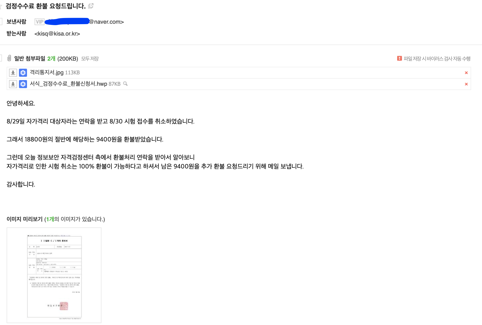 응시료가 18800원인데 며칠 후에 50%인 9400원이 입금되었습니당..ㅎ