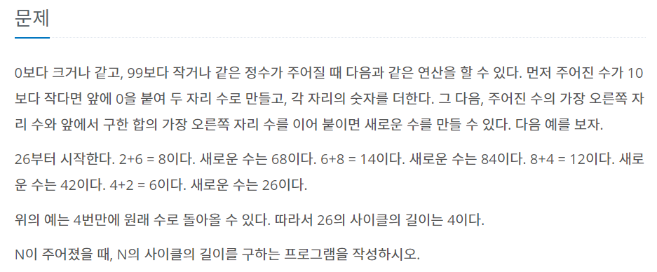 0보다 크거나 같고, 99보다 작거나 같은 정수가 주어질 때 다음과 같은 연산을 할 수 있다. 먼저 주어진 수가 10보다 작다면 앞에 0을 붙여 두 자리 수로 만들고, 각 자리의 숫자를 더한다. 그 다음,
