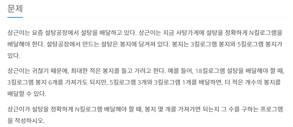 상근이는 요즘 설탕공장에서 설탕을 배달하고 있다. 상근이는 지금 사탕가게에 설탕을 정확하게 N킬로그램을 배달해야 한다. 설탕공장에서 만드는 설탕은 봉지에 담겨져 있다. 봉지는 3킬로그