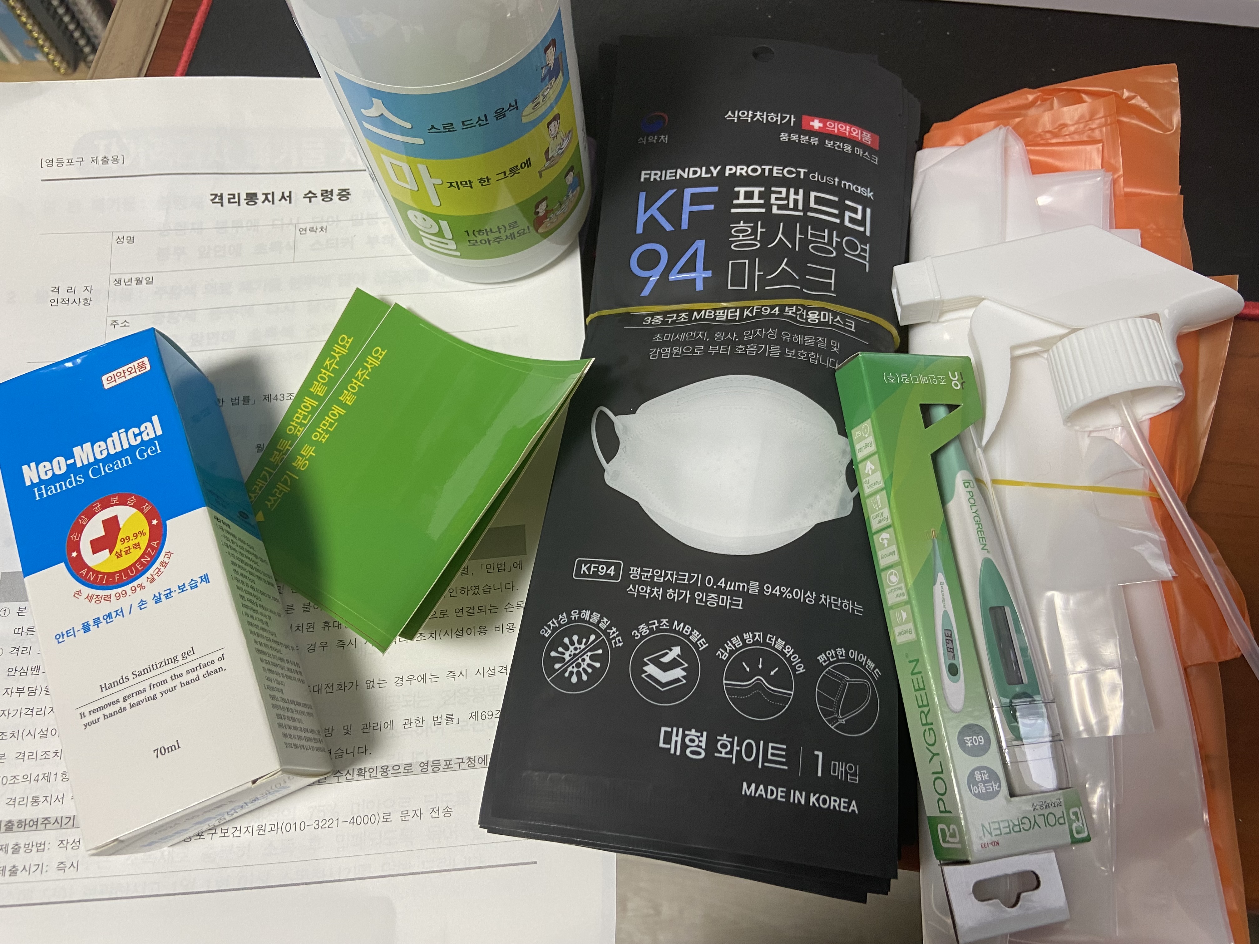 손소독제, 마스크, 체온계, 쓰레기봉투, 살균소독제가 들어있었습니다.
