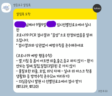 임시선별진료소에서 받으면 톡으로 와요!