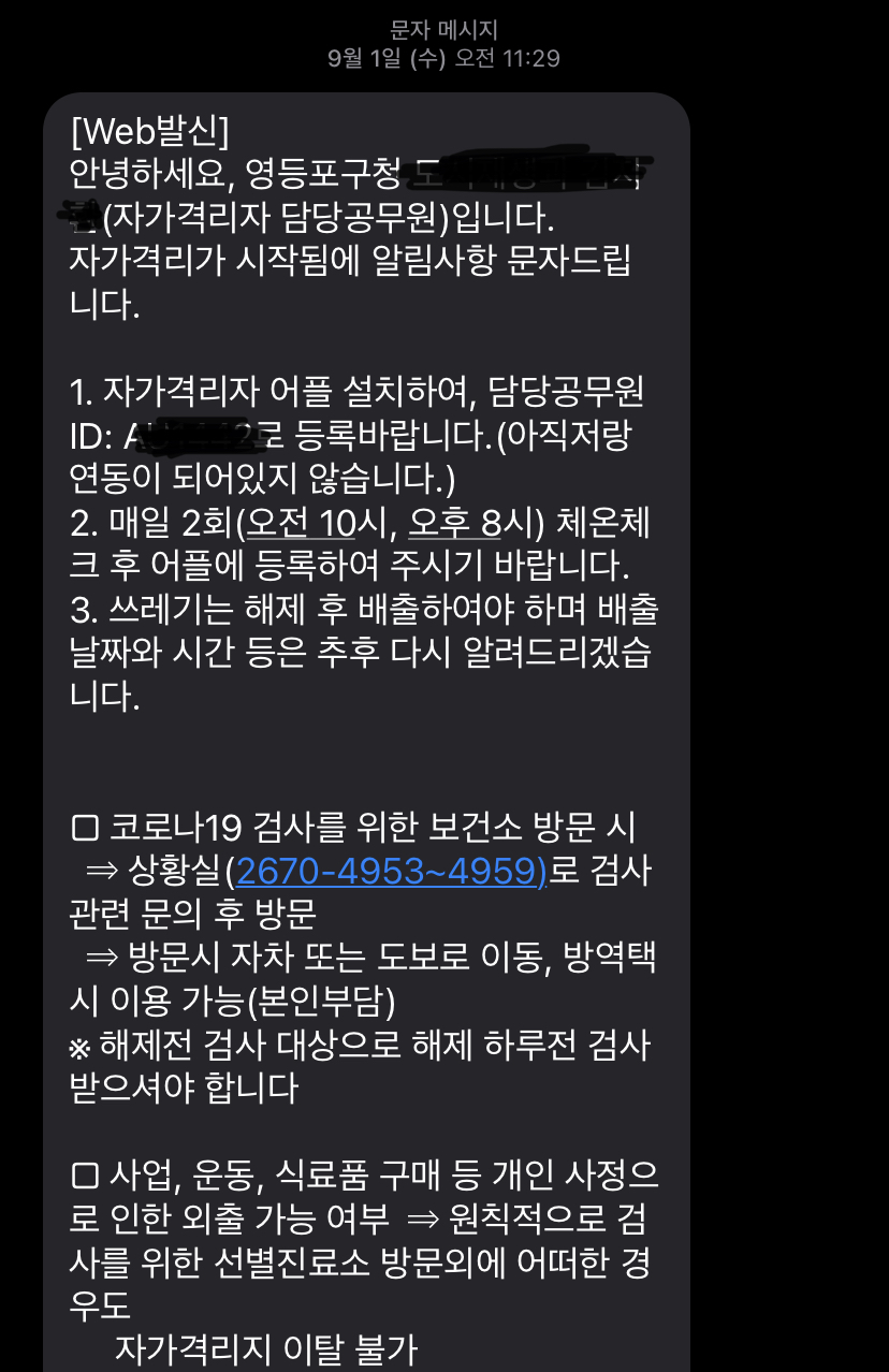 친구는 바로 다음날 열이 심하게 나서 병원가서 의사선생님의 권유로 코로나 검사를 받았고 양성판정을 받은 것이었습니닷.. 저도 연락받은 직후 코로나 검사받고 바로 자가격리를 시작했구요,, 그날 오후에 관할 보건소에서 연락이오더라구요,,