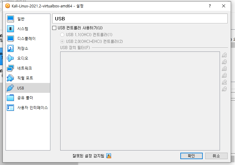 왼쪽 하단에 USB 클릭 > USB 컨트롤러 사용하기 체크 해제!