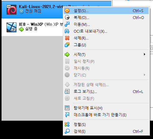 해결방법은 VirtualBox 처음 화면에서 설치한 Kali 마우스 오른쪽 버튼 클릭 > 설정