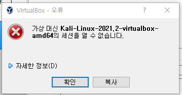 '가상머신 Kali-Linux-2021.2-virtualbox-amd64의 세션을 열 수 없습니다.'
