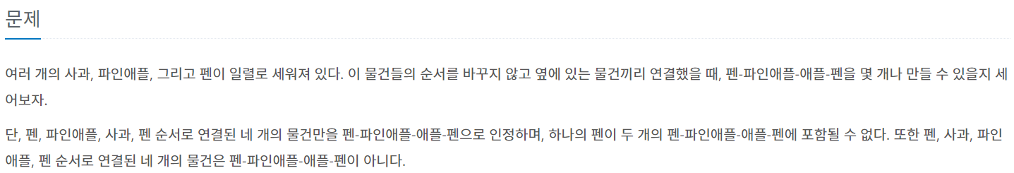 여러 개의 사과, 파인애플, 그리고 펜이 일렬로 세워져 있다. 이 물건들의 순서를 바꾸지 않고 옆에 있는 물건끼리 연결했을 때, 펜-파인애플-애플-펜을 몇 개나 만들 수 있을지 세어보자. 단, 펜,